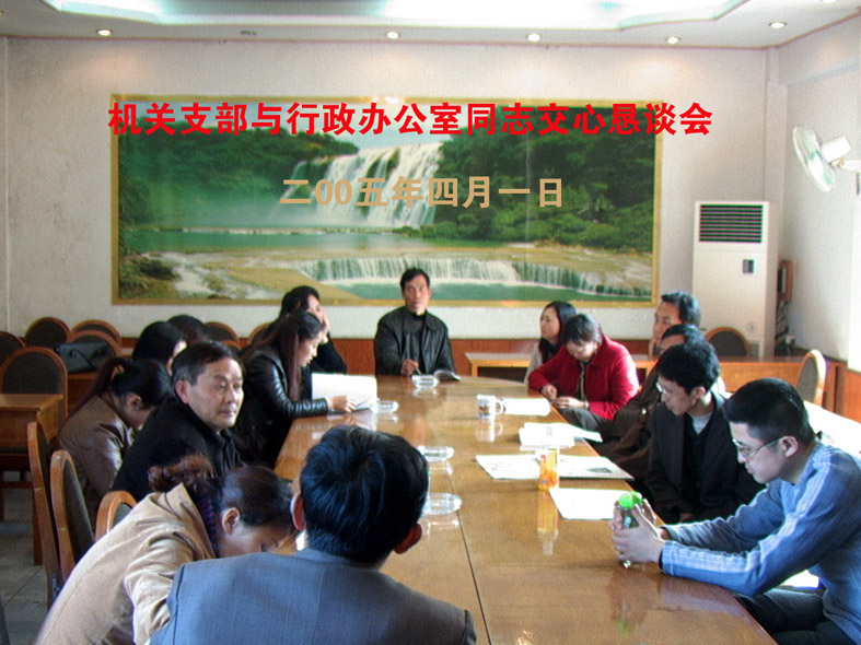 2005年4月1日院机关支部与行政办公室全体同志在院二楼会议室召开了交心恳谈会,会上大家给机关支部及党员同志提出了广泛中恳的意见和建议。总支委员邓永武同志主持了会议。